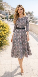 Fason z dopasowaną górą i rozkloszowanym dołem pięknie podkreśla talię, a rękawy o długości 3/4 dodają elegancji i uniwersalności. Model posiada podszewkę, co zwiększa komfort użytkowania, oraz zamek z tyłu, ułatwiający zakładanie.
