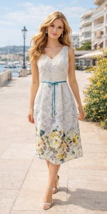 Sukienka utrzymana jest w szaro-złotym kolorze z delikatną fakturą materiału, a dół zdobi efektowny kwiatowy print w odcieniach żółci, zieleni, błękitu, granatu oraz subtelnych akcentów pomarańczu. Całość podkreśla cienki turkusowy pasek wiązany w talii, który pięknie modeluje sylwetkę.
