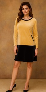11 Sukienka z weluru o luźnym kroju z kieszeniami kolor miodowo-czarny