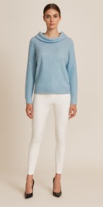 Ta stylowa bluzka wykonana z miękkiej, prążkowanej dzianiny w subtelnym odcieniu błękitu to idealny wybór na chłodniejsze dni.