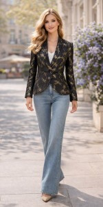 Elegancki żakiet Deni Cler czarny w złote ważki – luksusowy żakiet damski premium