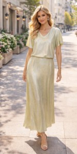 112 Złota połyskująca sukienka maxi Inter Irex – zwiewna, elegancka, rękaw motylek, z podszewką